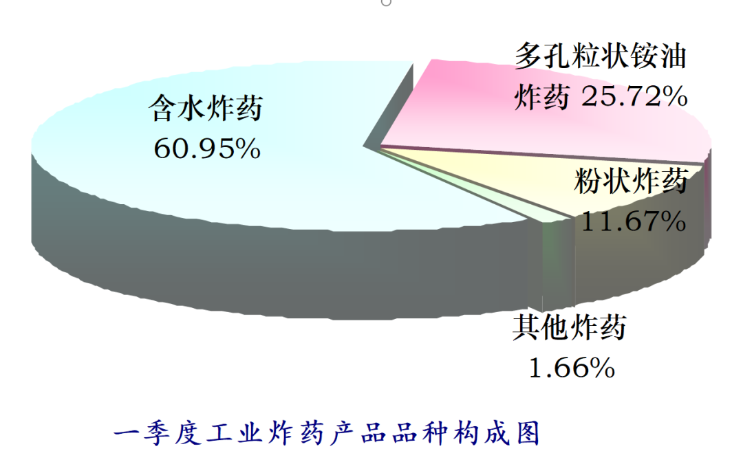 由于不同市场需求变化,民爆产品品种结构有所变化。从工业炸药品种产量看,一季度,含水炸药累计产量50.63万吨,同比减少6.21%,其中胶状乳化炸药累计产量50.36万吨,同比减少6.23%。多孔粒状铵油炸药累计产量21.36万吨,同比减少9.98%。粉状炸药累计产量9.70万吨,同比减少14.92%,其中膨化硝铵炸药累计产量为5.08万吨,同比减少6.77%。