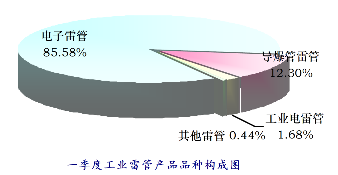 从工业雷管品种产量看,一季度,电子雷管累计产量为0.97亿发,同比减少17.18%,占工业雷管总产量的85.58%。导爆管雷管累计产量为0.14亿发,同比增加61.50%,占工业雷管总产量的12.30%。工业电雷管累计产量为0.019亿发,同比增加55.98%,占工业雷管总产量的1.68%。