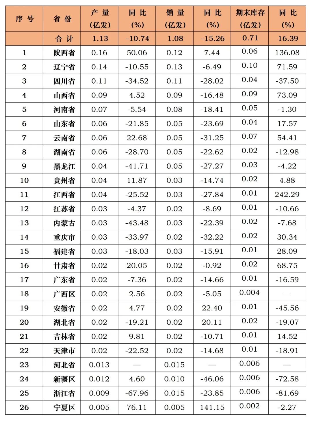 附表4 2026年1-3月工业雷管产销存总量排序表