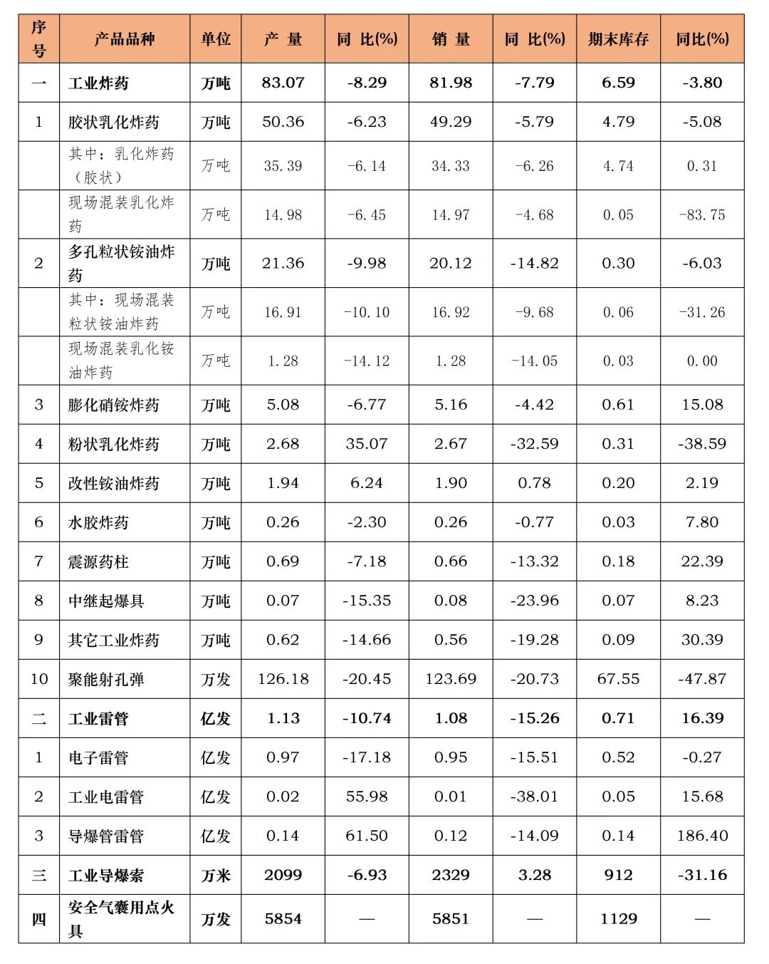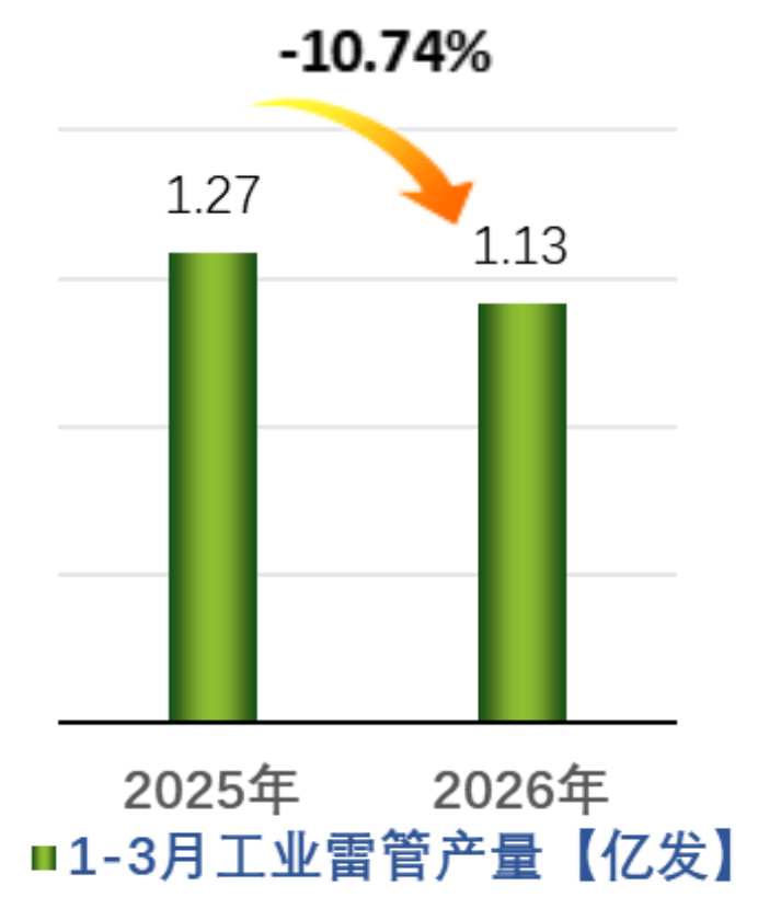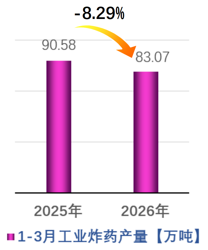 2026年一季度,受能源、原材料工业结构调整优化,转型升级影响,民爆产品市场需求回落,民爆行业主要统计指标均呈下行态势。